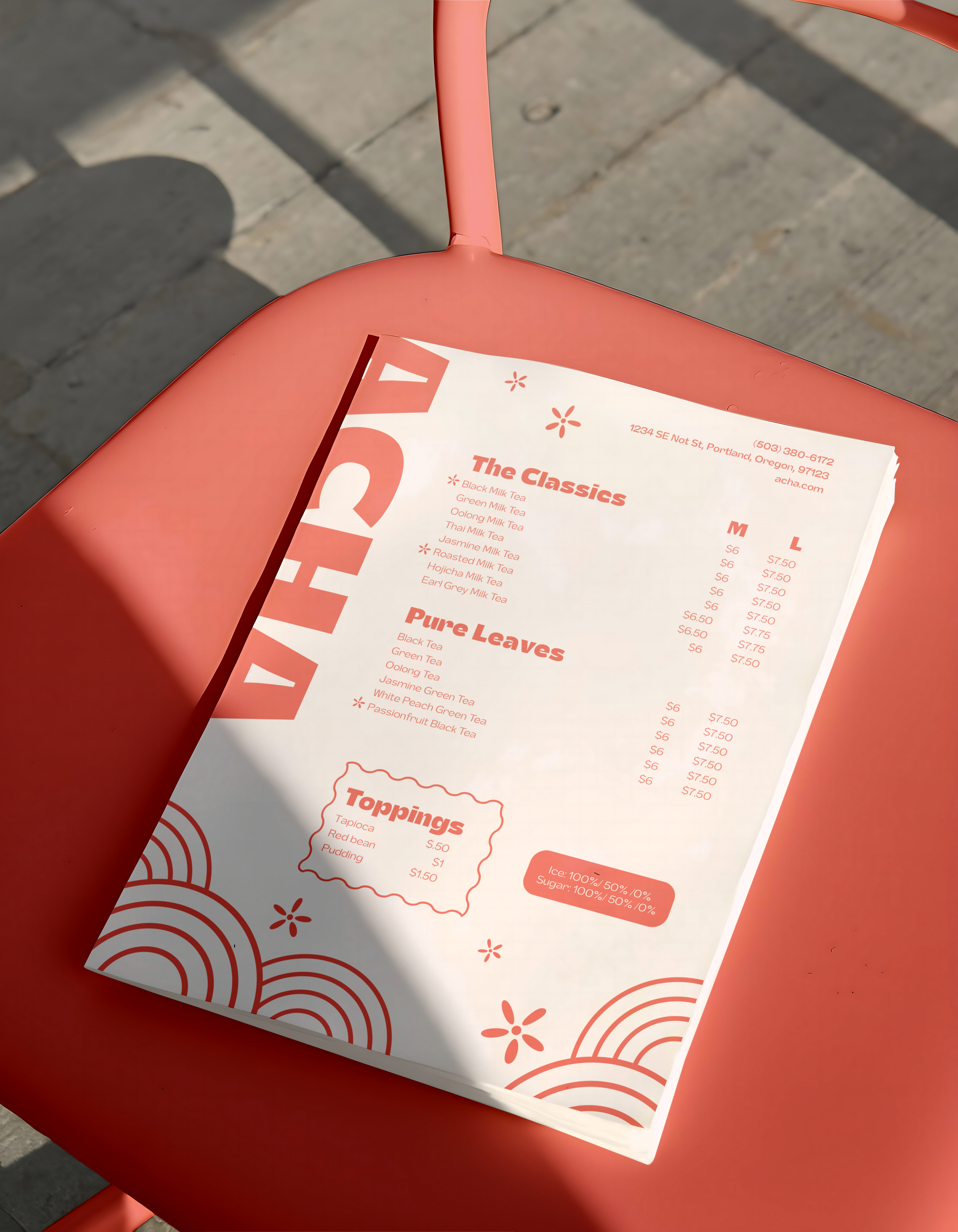 Acha is a modern milk tea brand inspired by the Chinese character 囧. It captures the cheerfulness, the absurdity, and the endearing cluelessness of today’s youth. With soft pastel pink as its primary color, Acha is a gentle stopover— where comfort, sweetness, and a bit of beautiful nonsense brew together in every cup.