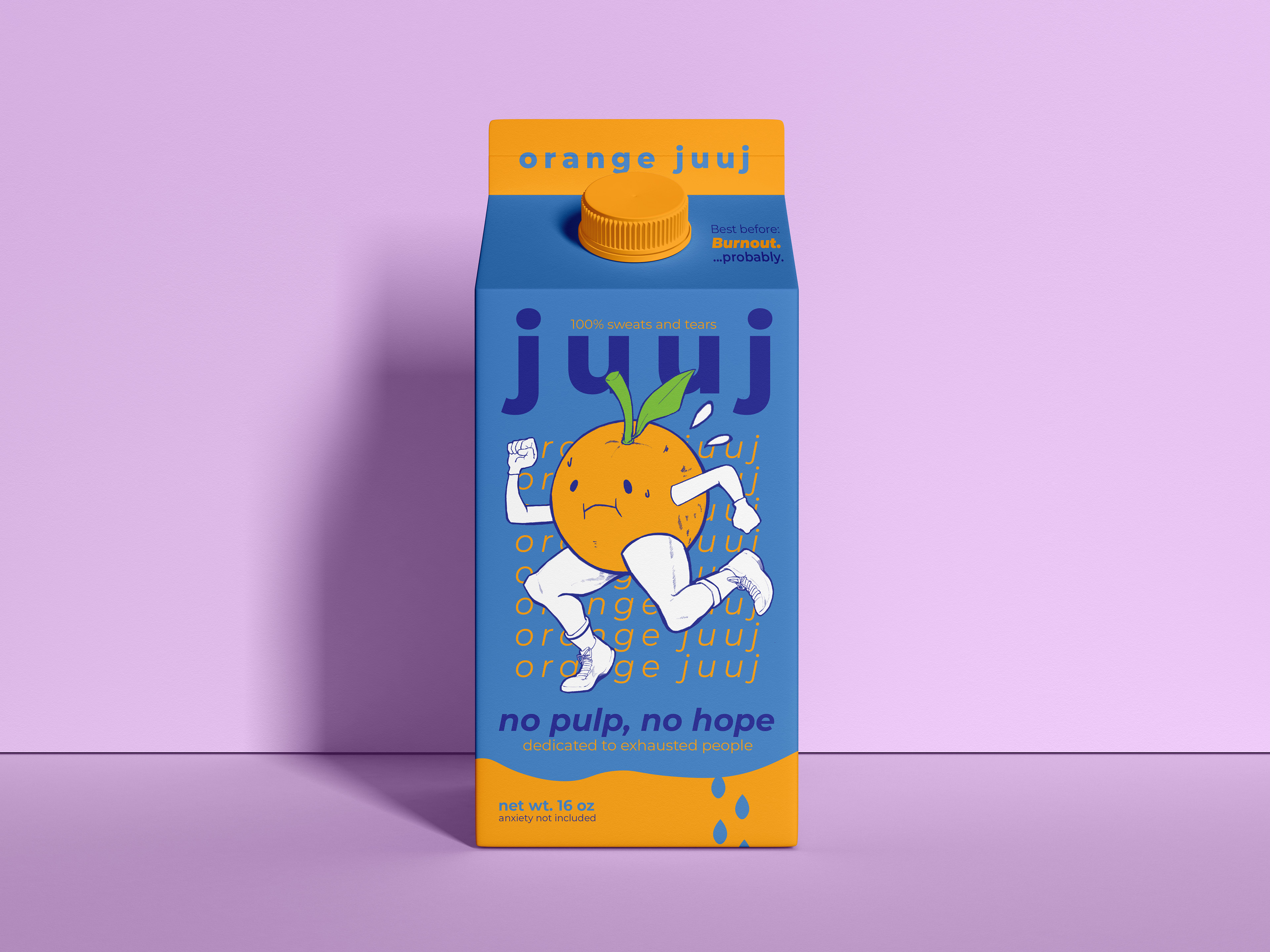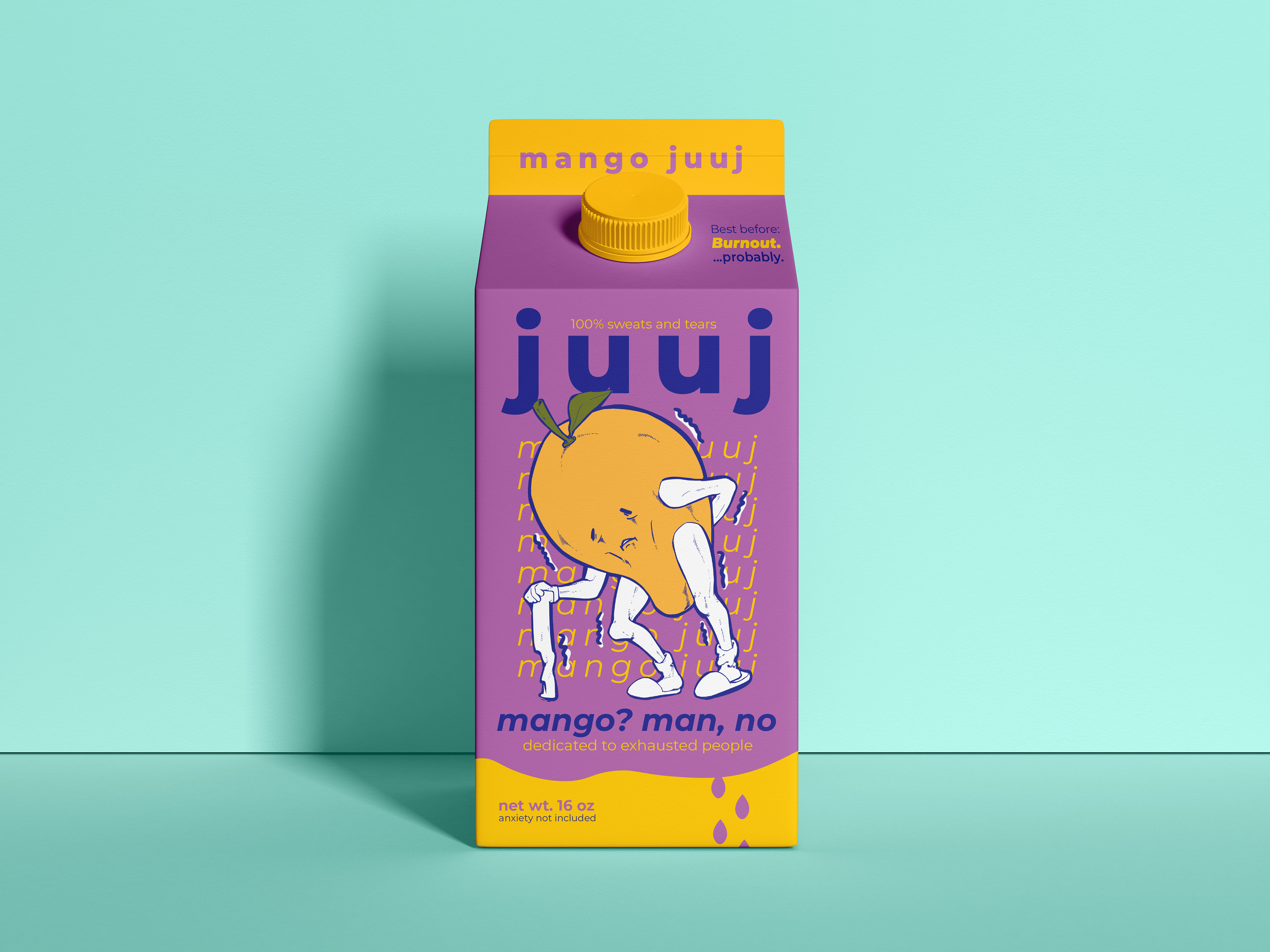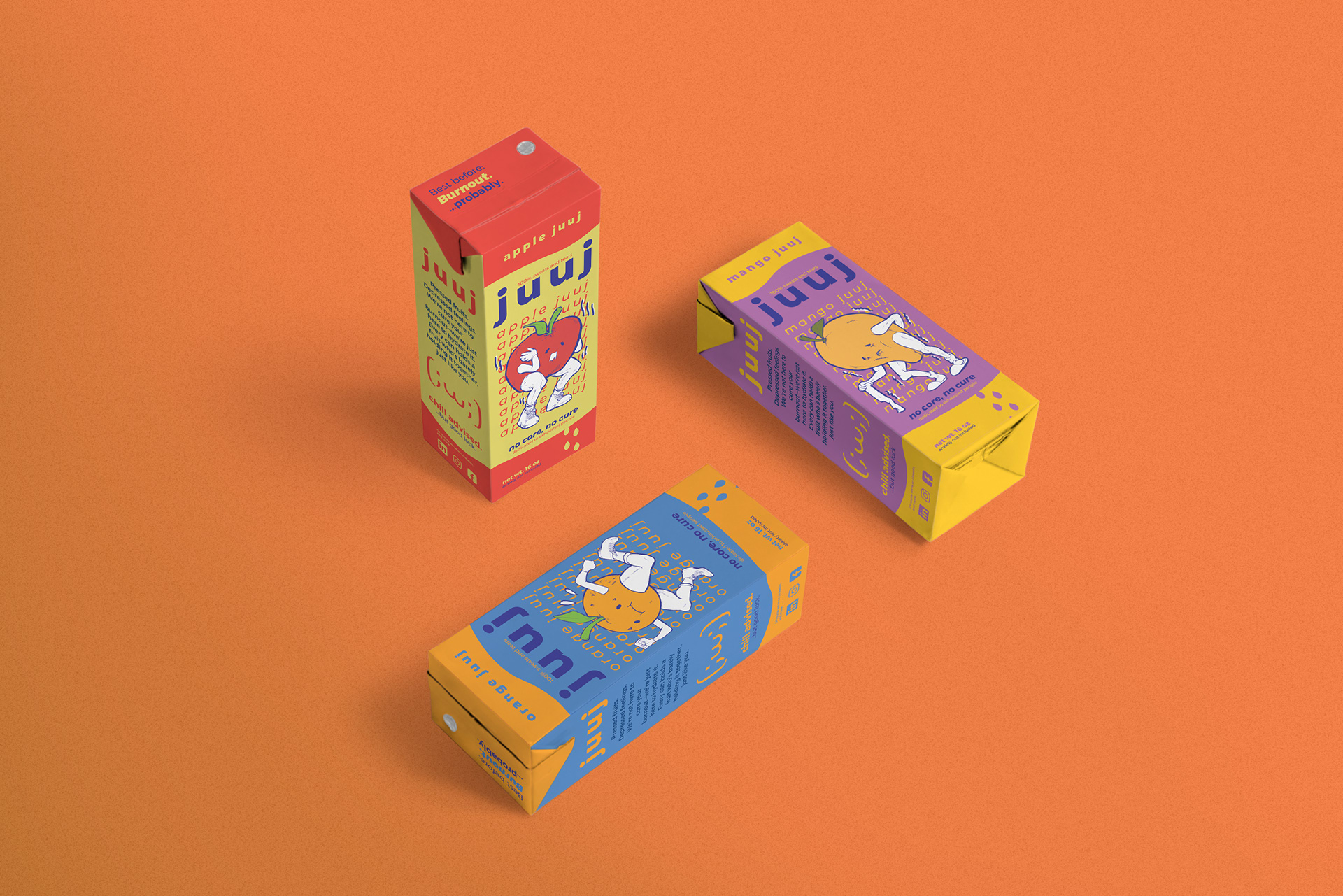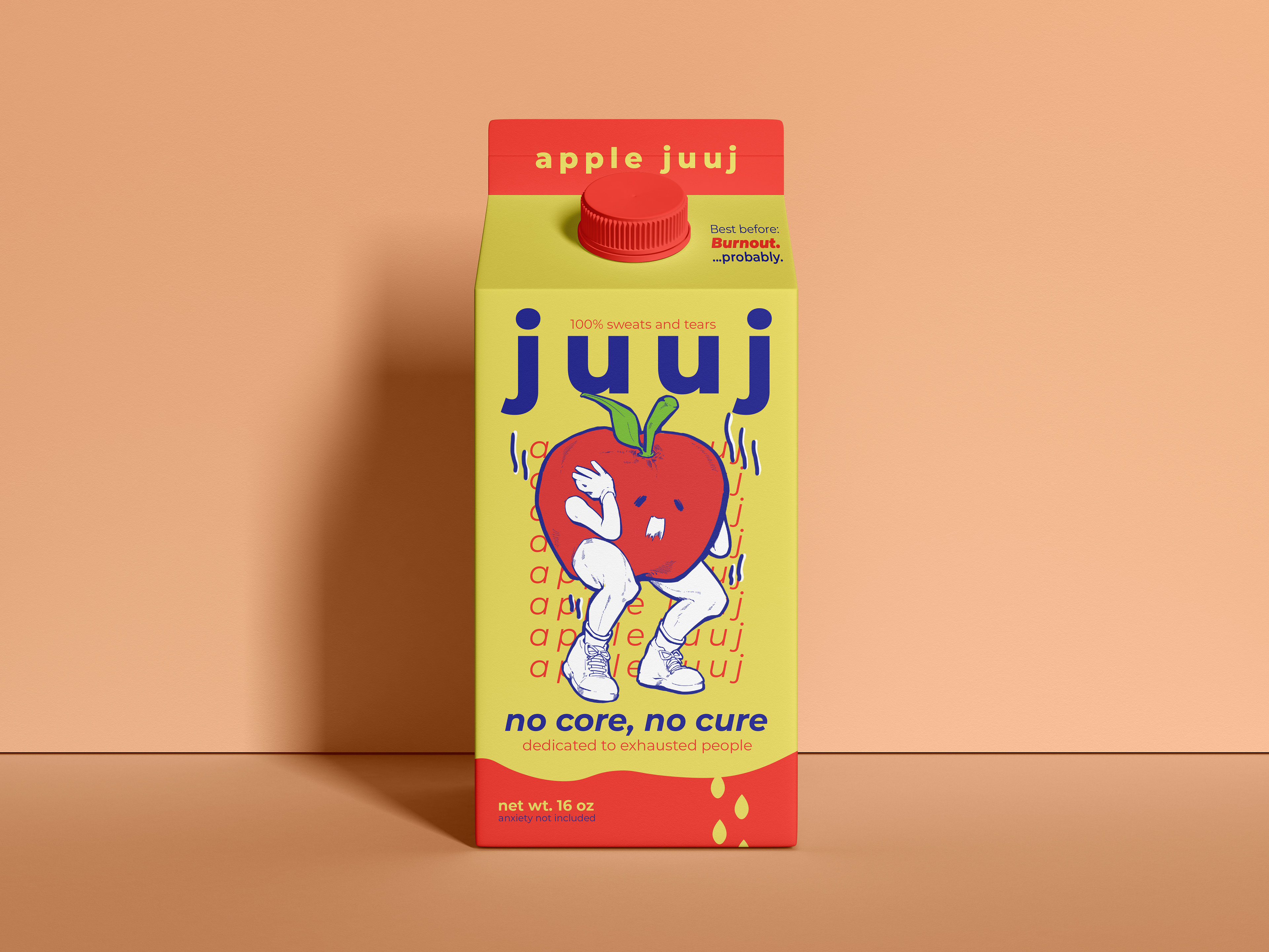 This project is a satirical take on today’s toxic optimism pushed by mass media, where everyone is supposedly “doing amazing,” wearing a “big smile,” and “loving life.” The juice packaging, branded “juuj” and inspired by the crying kaomoji “;w;”, serves as a gentle pause: An exhale, a comma in our busy lives. It conveys a simple message: it’s okay to be tired, burnt out, or even a little mean sometimes. If anything, these fruits will sit with you through your darkest moments. Let’s allow ourselves to be sad.