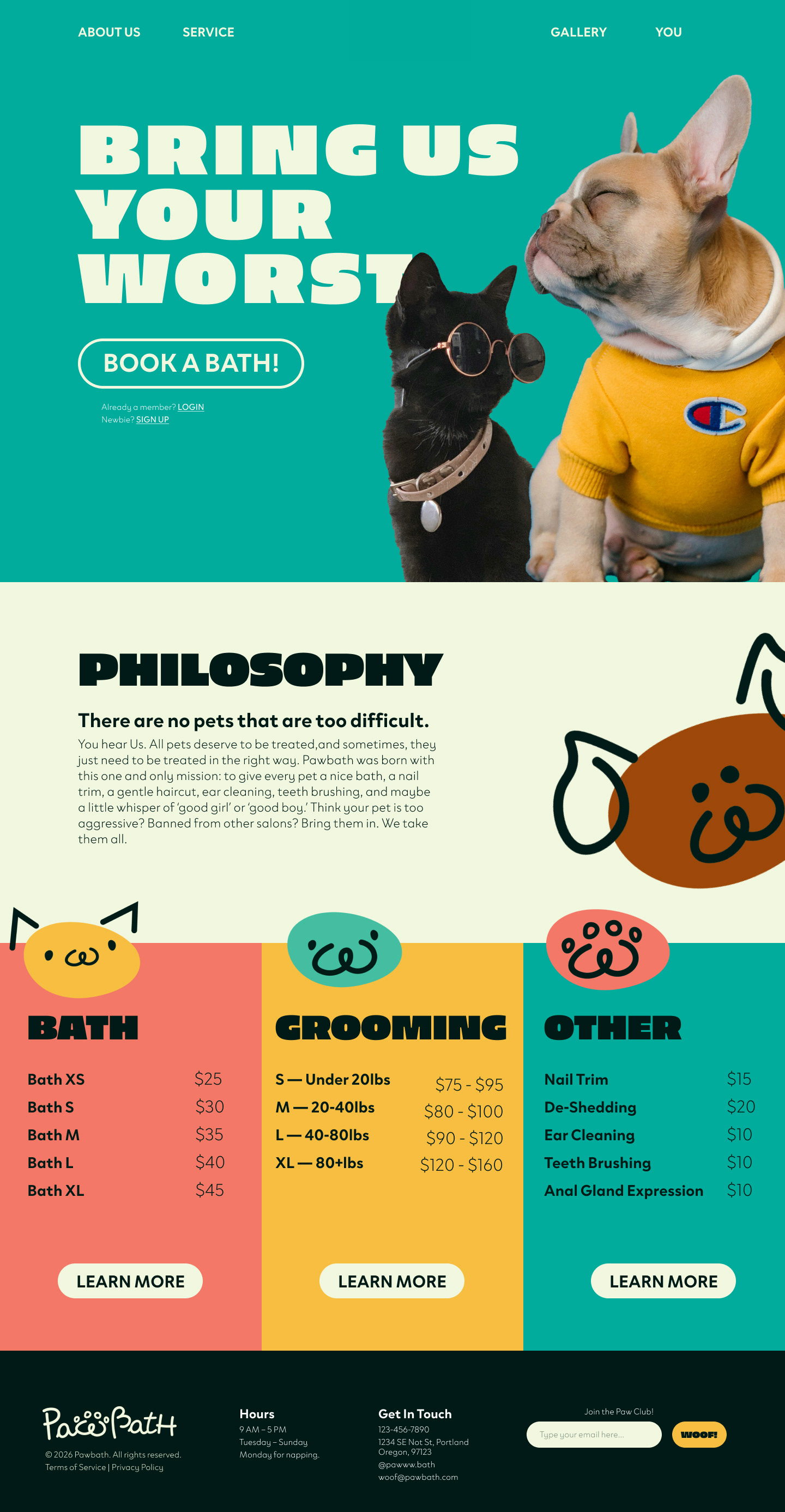 Pawbath is a small-animal bathhouse in Portland, known for a loyal local clientele, primarily older adults in the neighborhood. They are now looking to expand their reach to a broader audience, including Gen Z and Millennials across the Portland Metropolitan area. For this rebrand, I focused on highlighting Pawbath’s fun, quirky personality while learning and experimenting with motion design. This project allowed me to explore how motion can bring brand personality to life and engage a younger, digitally-savvy audience.